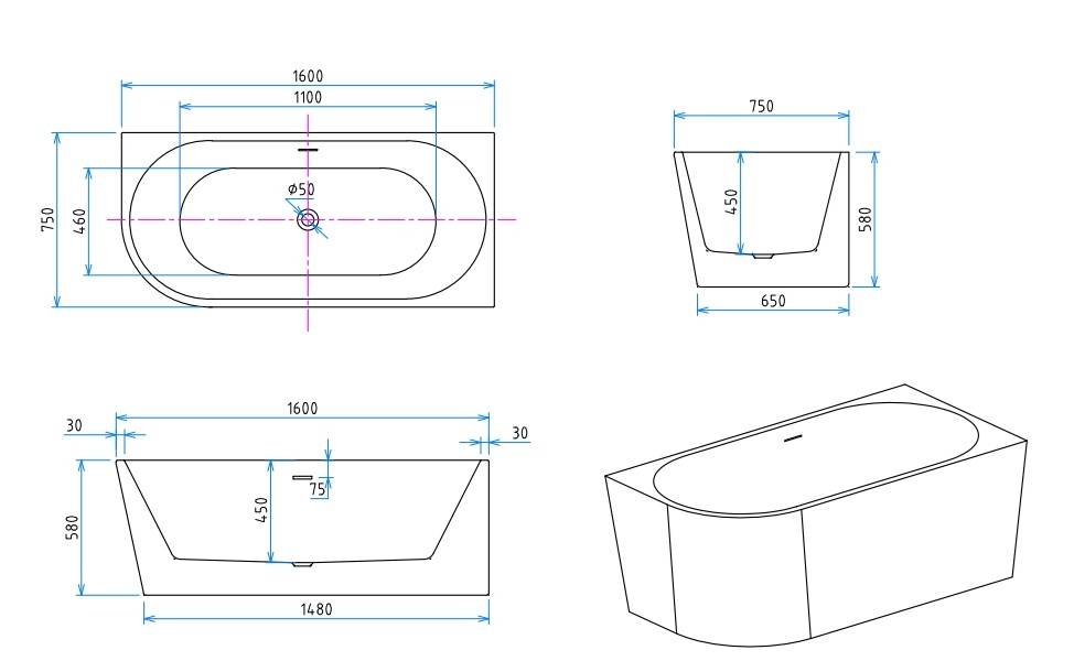 Łazienka z wanną wolnostojąca narożną LAOLA 160x75 w wersji prawejpon. - piąt. ---------- 08:00 - 16:00